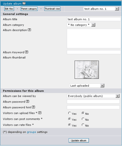 The album properties page can be accessed by clicking on "Properties" item next to the thumbnail that represents a particular album.