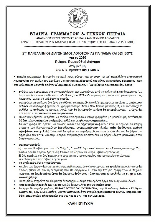 Η Εταιρεία Γραμμάτων και Τεχνών Πειραιά προκηρύσσει τον ΣΤ' Πανελλήνιο Διαγωνισμό Λογοτεχνίας στη μνήμη του μεγάλου μας ποιητή και ιδρυτικού της μέλους Νικηφόρου Βρεττάκου, που απευθύνεται σε μαθητές από Δ' Δημοτικού έως Γ' Λυκείου.